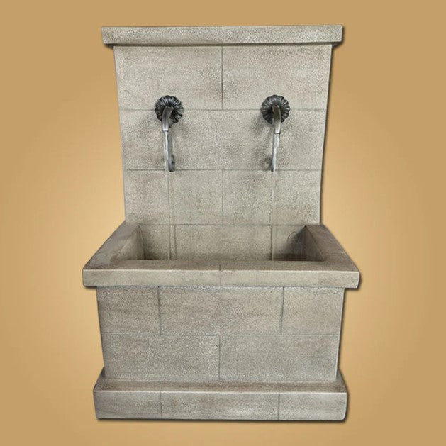 The Antibes Deux Wall Fountain for Rustic Spouts is a refined, wall-mounted water feature that brings a touch of Old World charm to your outdoor space. Handcrafted in the USA from premium fiber-reinforced cast stone concrete, this fountain is built for longevity and visual appeal. Shown in a rich Walnut (WL) finish and designed for use with two GI-126 rustic spouts (sold separately), it offers the soothing sound of cascading water with a plug-and-play setup—no plumbing required. A perfect choice for courtyards, patios, or garden walls, this custom fountain combines durability, beauty, and timeless style.