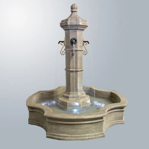 The Roubaix Pond Fountain For Spouts is a beautifully designed outdoor centerpiece that brings elegance and a soothing water ambiance to any garden or courtyard. Expertly handcrafted in the USA using fiber-reinforced cast stone concrete, this fountain is both visually striking and built to last. It features a recirculating electric pump and a concrete spout, with optional decorative spouts and LED lights available for added customization. Its wide, low-profile design makes it ideal for expansive outdoor settings, and the hand-applied finish ensures every fountain is truly one of a kind.